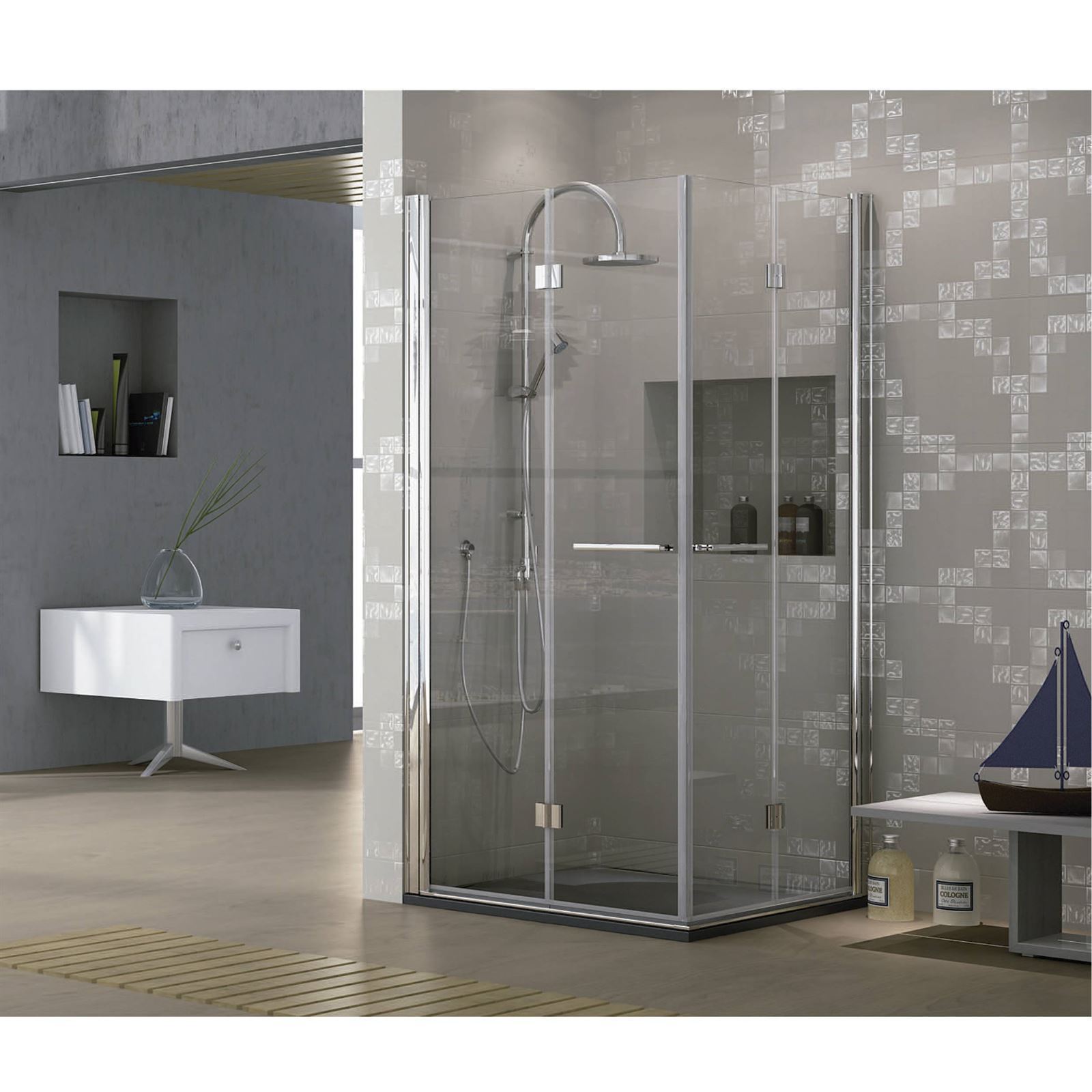Mampara de ducha compuesta de 4 hojas plegables. Acabado anodizado brillo vidrio templado transparente o serigrafía. Sistema de bisagra elevable vidrio a vidrio acabado cromo. Perfil de compensación hasta 15 mm por cada lado, fijación por extensores laterales. Cierre magnético mediante goma imán translúcida en el vértice. Juntas de goma inferior y perfil base de aluminio para mayor estanqueidad. Tirador asa doble de 216 mm. Altura estándar 188.3 cm.